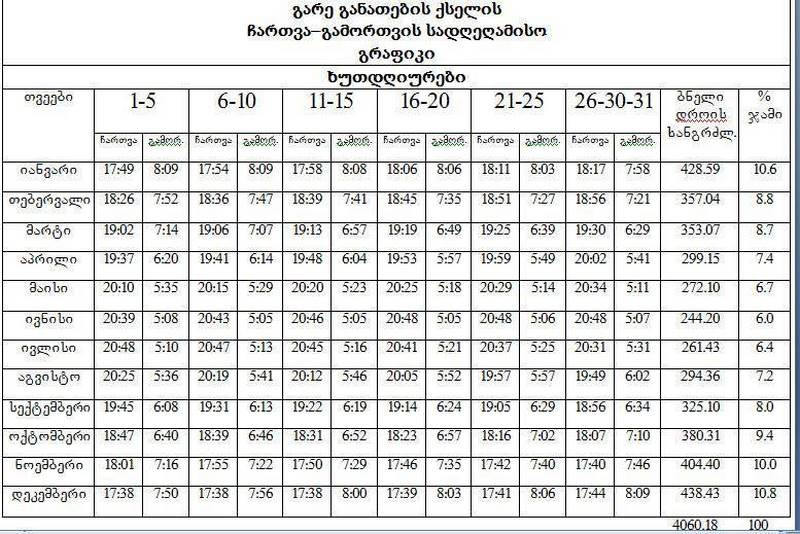 შპს “თბილსერვის ჯგუფის” მიერ მთელი ქალაქის მასშტაბით გარე განათების ჩართვა ყოველდღიურად მართვისა და კონტროლის მოწყობილობის მეშვეობით ხორციელდება. არსებობს სპეციალურად შედგენილი პროგრამა, რომელიც წელიწადის სხვადასხვა სეზონზე გარე განათების ჩართვის განსხვავებულ დროს გულისხმობს. შესაბამისად, ზაფხულის დადგომასთან ერთად შეიცვალა აღნიშნული დრო და გარე განათება ყოველდღიურად, 20:45 საათზე პროგრამულად ირთვება.