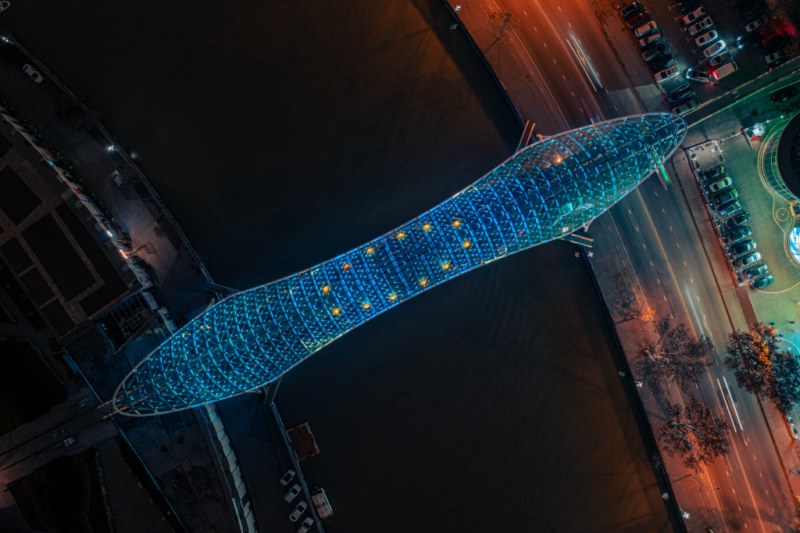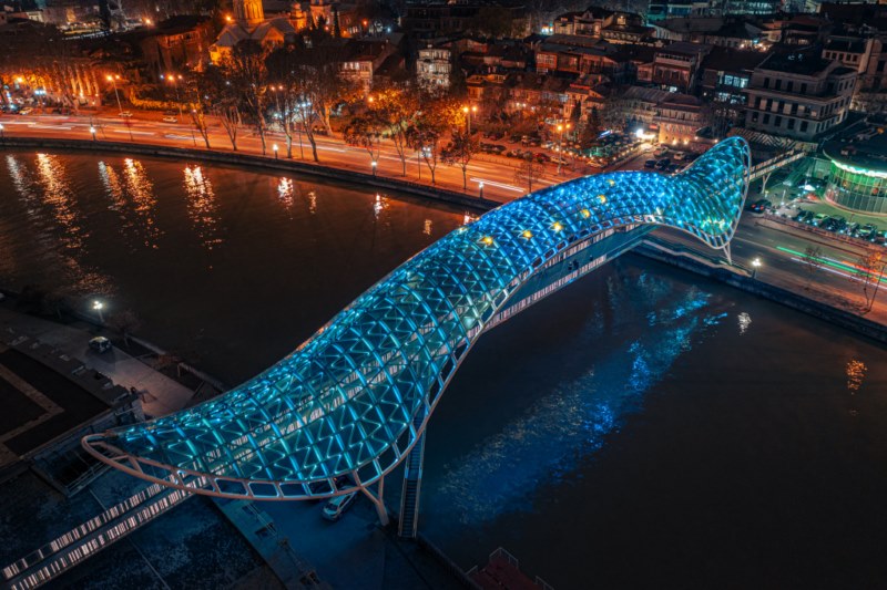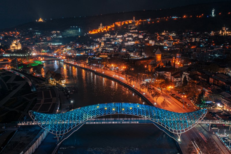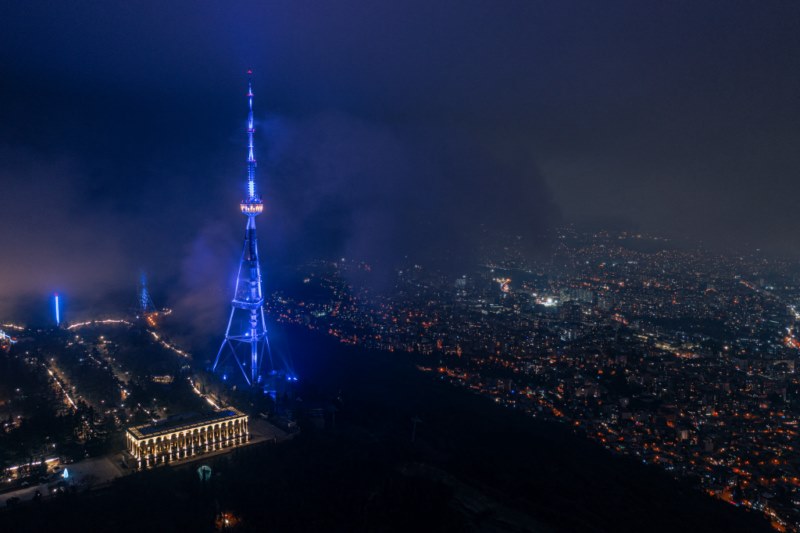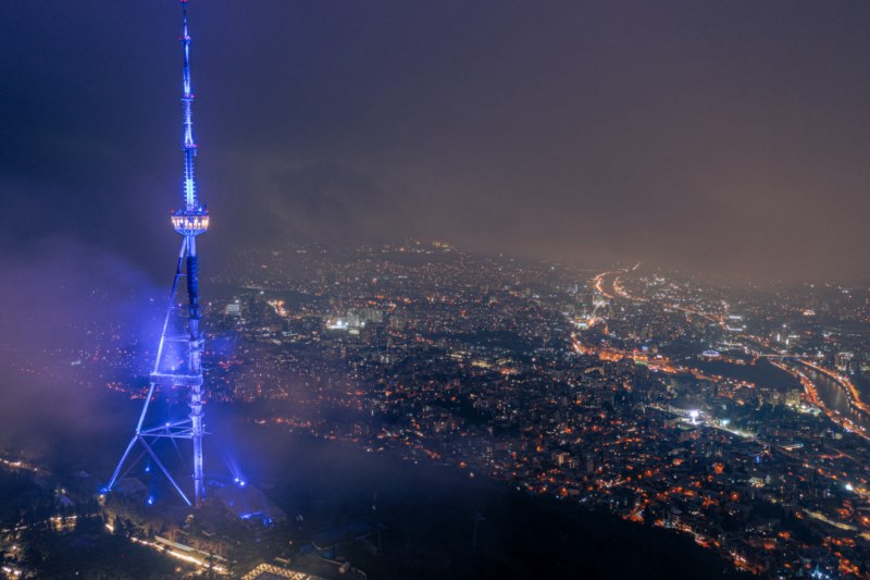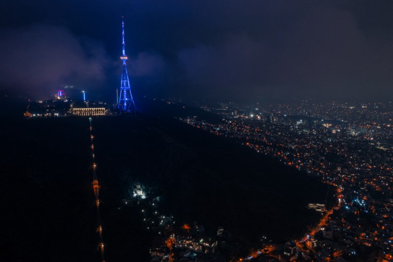 Peace Bridge and Tbilisi TV Tower in the Colors of the European Union