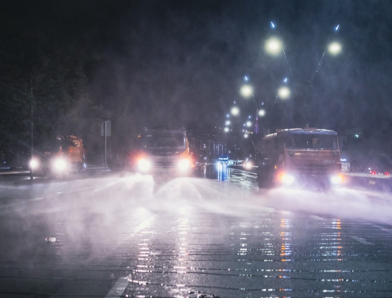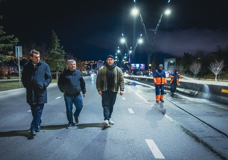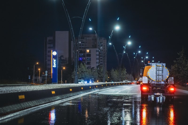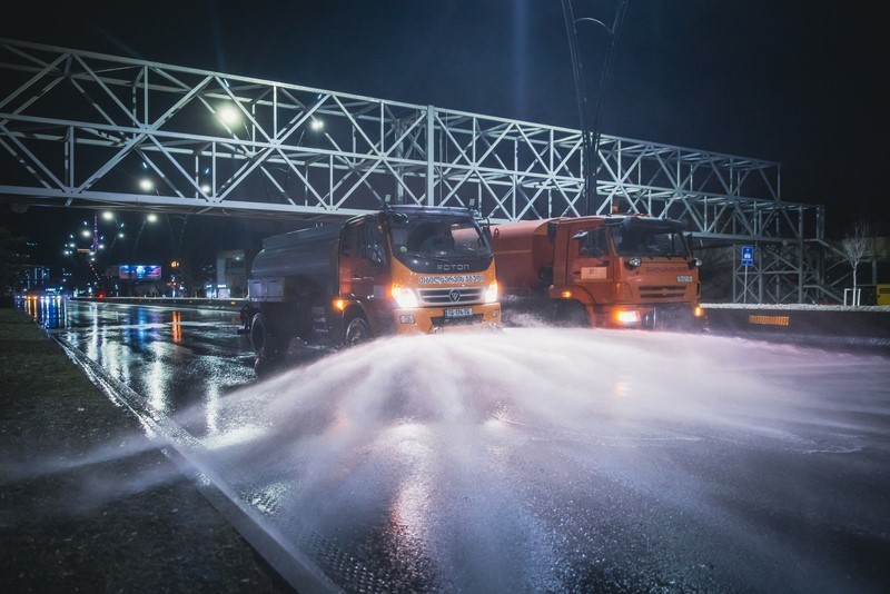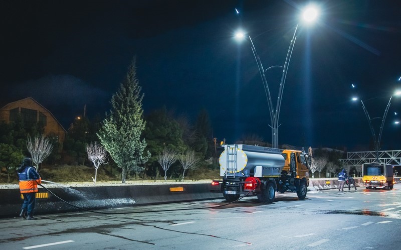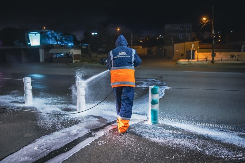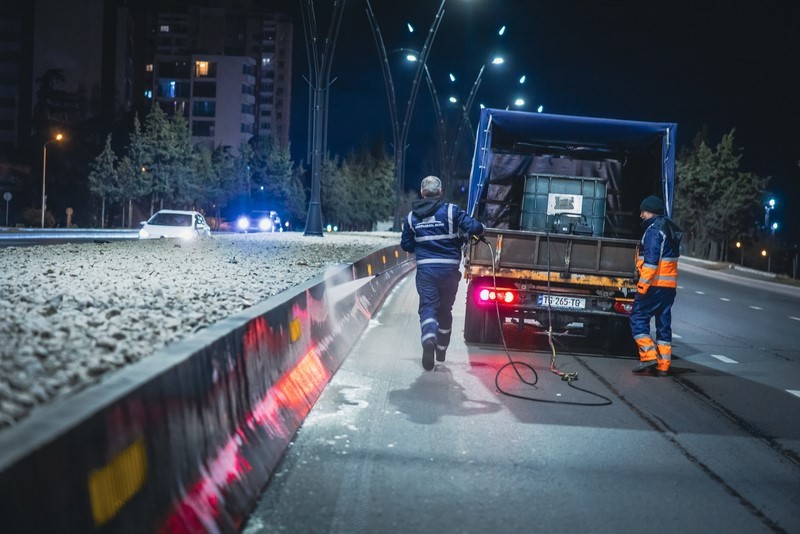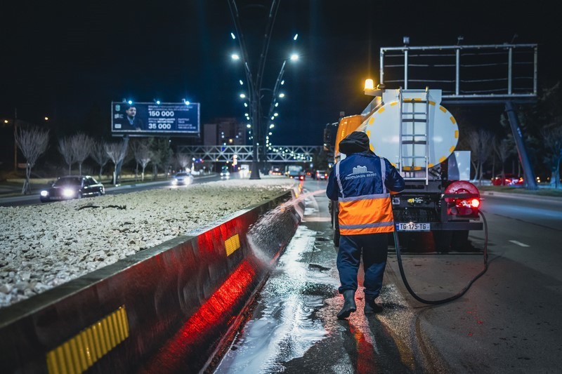 კახეთის გზატკეცილზე სპეცტექნიკით მოირეცხა გზის სავალი ნაწილი, გზაგამყოფი და ბოძკინტები.